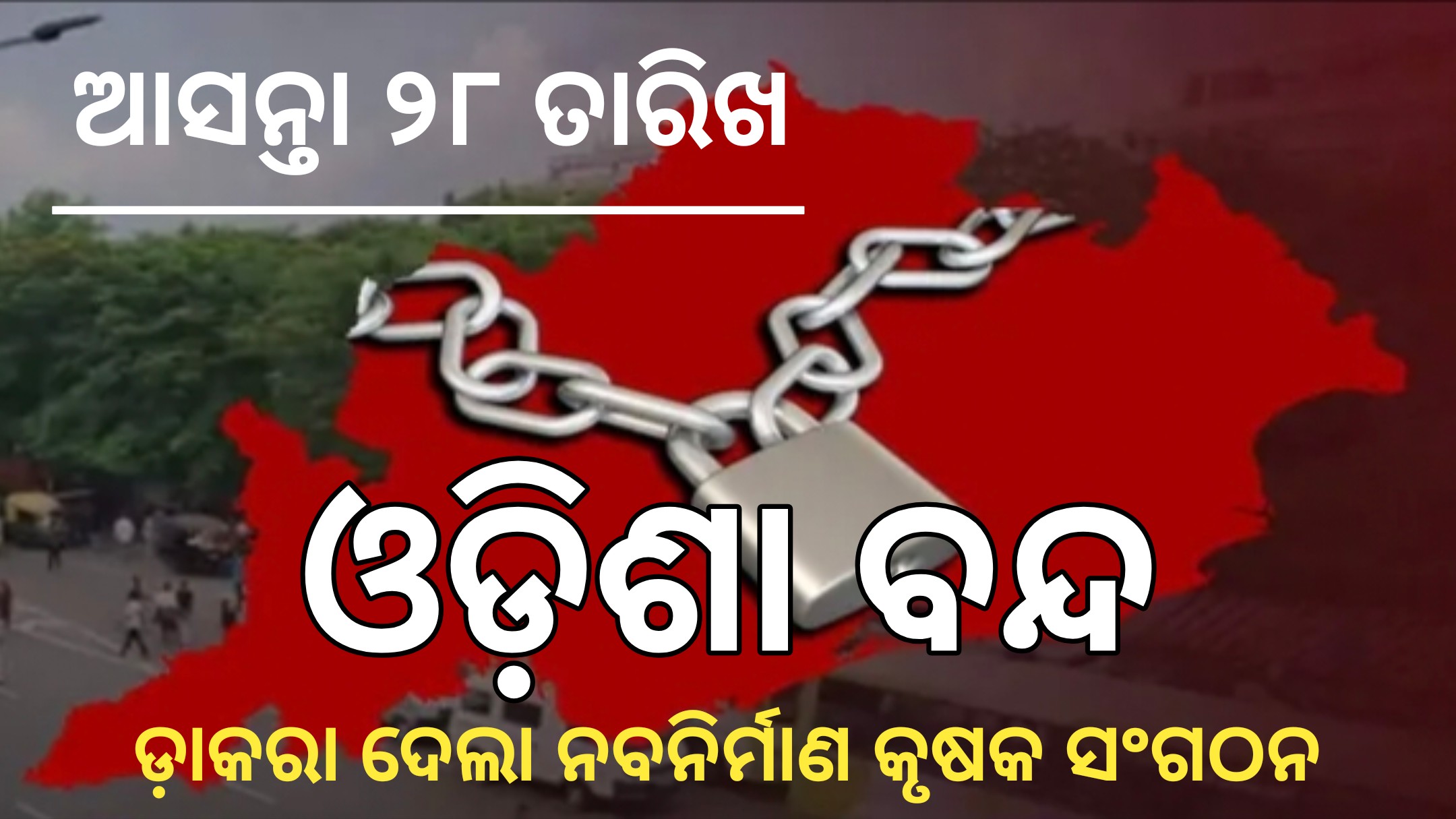 ଆସନ୍ତା କାଲି ଜାନୁୟାରୀ ୨୮ ରେ ଓଡ଼ିଶା ବନ୍ଦ । ଓଡ଼ିଶା ବନ୍ଦ ଆନ୍ଦୋଳନ ଡ଼ାକରା ଦେଇଛି ନବ ନିର୍ମାଣ କୃଷକ ସଂଗଠନ । ଧାନମଣ୍ଡି ଓ ଧାନବିକ୍ରିରେ ଅବ୍ୟବସ୍ଥା, ପ୍ରଦୂଷଣ ସାର୍ଟିଫିକେଟ ନାଁରେ