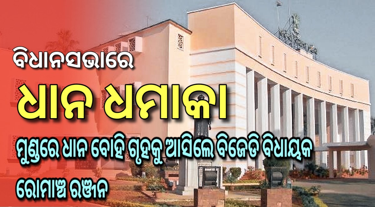 ବିଧାନସଭାରେ ଧାନ ଧମାକା । ଗୃହରେ ଧାନ ରଖି ବିଜେଡିର ଜୋରଦାର ପ୍ରତିବାଦ । ବିଧାୟକ ରୋମାଞ୍ଚ ରଞ୍ଜନ ବିଶ୍ୱାଳ ମୁଣ୍ଡରେ ଗାମୁଛା ବାନ୍ଧି ଗୋଟିଏ ଧାନ ବସ୍ତା ମୁଣ୍ଡାଇ ଗୃହ ମଧ୍ୟଭାଗକୁ ଆସିବା